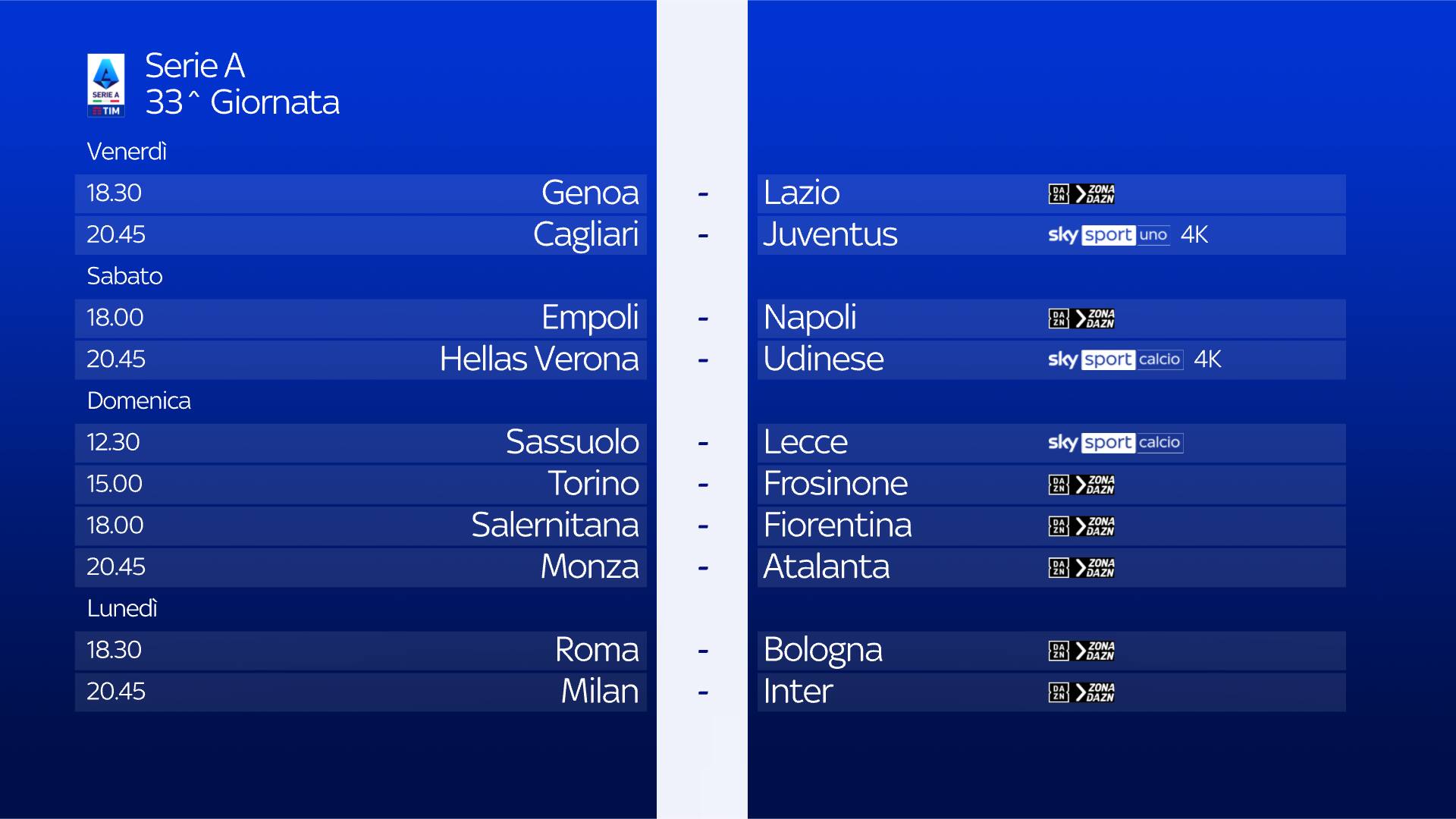 guida tvLa partita tra Genoa e Lazio che apre la 33^ giornata di Serie A si gioca venerdì 19 aprile alle 18.30 e sarà in diretta sulla app di DAZN e su ZONA DAZN, disponibile al canale 214 del telecomando Sky