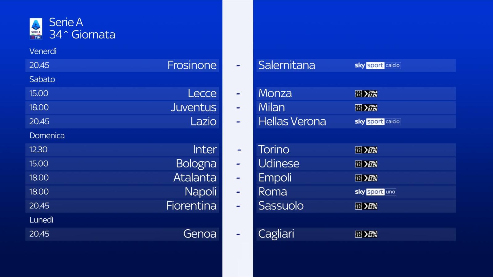 guida tvLa partita tra Juve e Milan della 34^ giornata di Serie A si gioca sabato 27 aprile alle 18 e sarà in diretta sulla app di DAZN e su ZONA DAZN, disponibile al canale 214 del telecomando Sky