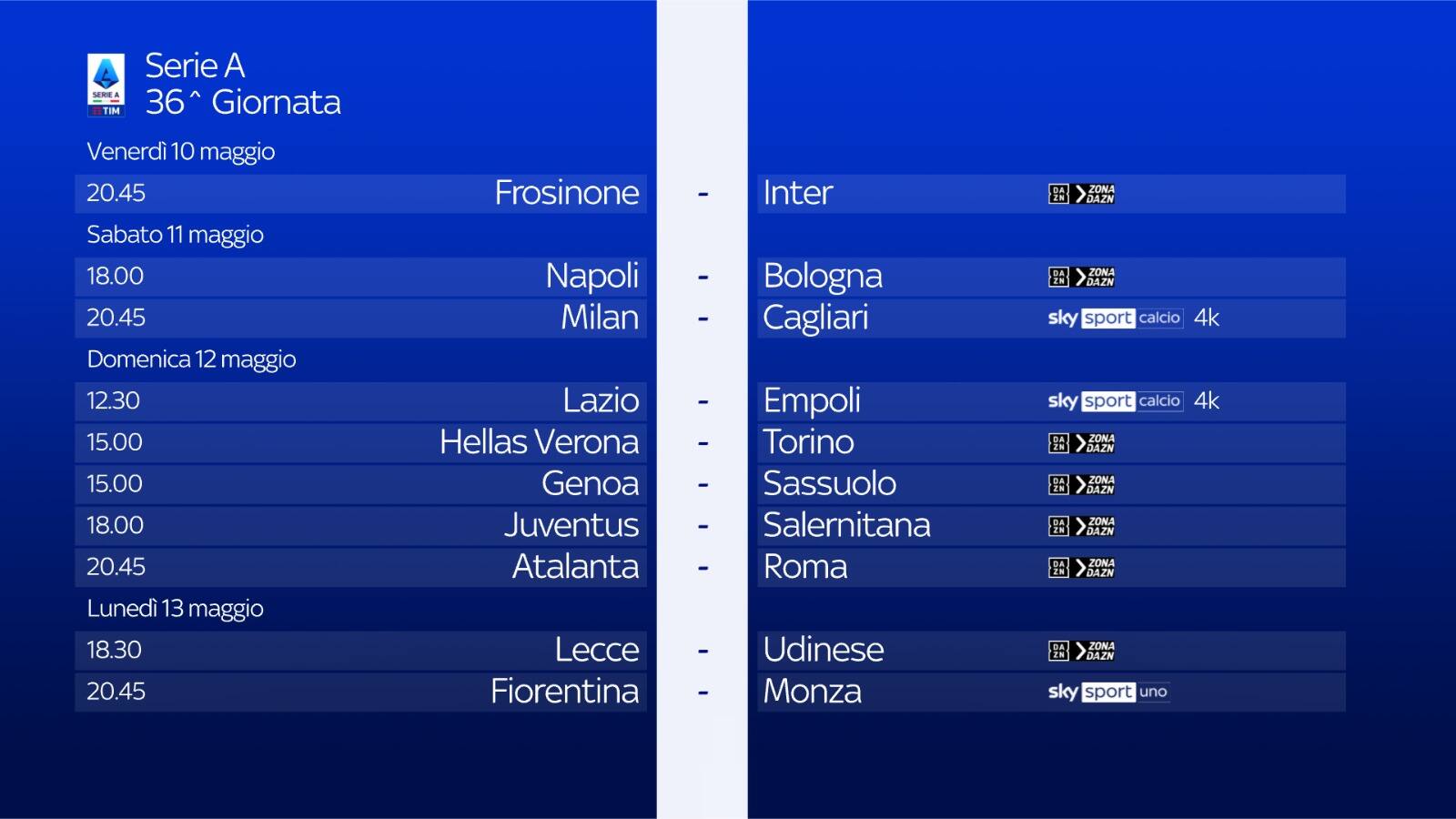 Sono due gli appuntamenti del sabato della 36^ giornata di campionato. Alle 18.00 Napoli-Bologna a seguire, alle 20.45, Milan-Cagliari, in diretta su Sky Sport Calcio, Sky Sport 251 e Sky Sport 4K e in streaming su NOW. Telecronaca di Andrea Marinozzi con il commento di Luca Marchegiani. I collegamenti a bordocampo sono a cura di Giuseppe Di Stefano e Manuele Baiocchini.