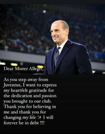 Anche Weah ha voluto salutare con una storia su Instagram Allegri: "Caro mister, vostro esprimere la mia sincera gratitudine per la passione che hai portato al club. Grazie per aver creduto in me e per avermi cambiato la vita. Sarò per sempre in debito con te".