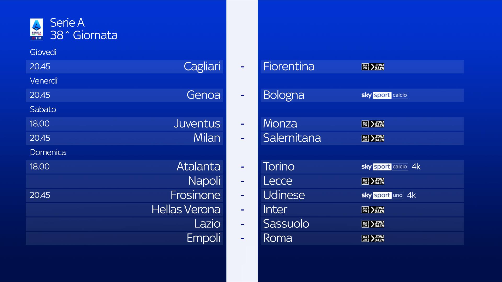 guida tvIl sabato della 38^ giornata di Serie A, ultima di campionato per la stagione 2023/24, vede due partite: alle 18.00 Juventus-Monza e alle 20.45 Milan-Salernitana