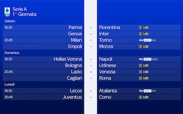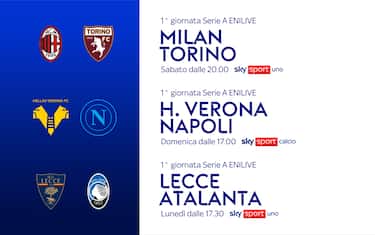 La prima giornata di Serie A si gioca da sabato 17 a lunedì 19 agosto. Le 3 partite in diretta su Sky e in streaming su NOW saranno: Milan-Torino, Hellas Verona-Napoli e Lecce-Atalanta. La giornata inizia con gli anticipi del sabato, alle 18:30, Genoa-Inter e Parma-Fiorentina. Alle 20:45 invece è il turno di Empoli-Monza e Milan-Torino, in diretta su Sky Sport Calcio, Sky Sport Uno, Sky Sport 4K con la telecronaca di Federico Zancan e il commento di Riccardo Montolivo. Inviati Peppe Di Stefano e Paolo Aghemo. La domenica si apre alle 18:30, con Bologna-Udinese e Hellas Verona-Napoli, visibile su Sky Sport Calcio, Sky Sport 4K: telecronaca di Stefano Borghi e Blerim Dzemaili, inviati Marina Presello e Massimo Ugolini. Alle 20:45 è la volta di Cagliari-Roma e Lazio-Venezia. Due i posticipi del lunedì: alle 18.30 Lecce Atalanta, live su Sky Sport Uno e Sky Sport Calcio con la telecronaca di Davide Polizzi e il commento di Massimo Gobbi. Inviati Francesco Modugno e Massimiliano Nebuloni. Alle 20:45 Juventus-Como.