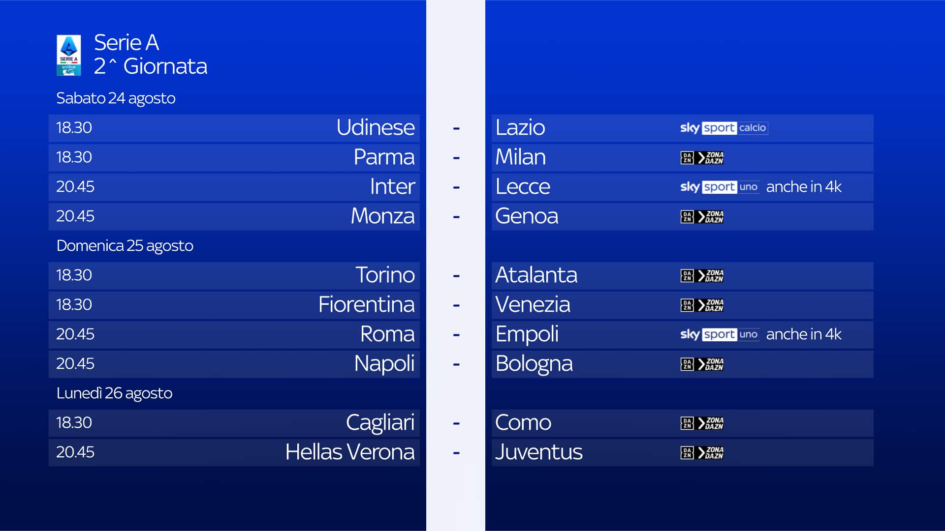 guida tvLa partita tra Parma e Milan si gioca sabato 24 agosto alle 18.30 e sarà in diretta sull'app di DAZN e sul canale DAZN, disponibile al canale 214 del telecomando Sky