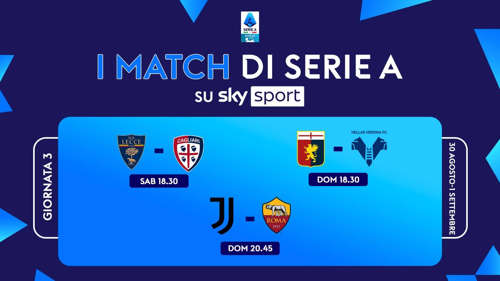 Il terzo turno di Serie A si gioca da venerdì 30 agosto a domenica 1^ settembre. Le 3 partite in diretta su Sky e in streaming su NOW saranno: Lecce-Cagliari, Genoa-Verona e il Big Match Juventus-Roma. La giornata di campionato inizia venerdì 30 agosto con Venezia-Torino alle 18.30 e Inter-Atalanta alle 20.45. Sono quattro gli appuntamenti del sabato che vede scendere in campo alle 18.30 Lecce-Cagliari, in diretta su Sky Sport Calcio, Sky Sport 251, Sky Sport 4K e in streaming su NOW, e Bologna-Empoli. Doppio appuntamento anche la sera, alle 20.45, con Lazio-Milan e Napoli-Parma. La giornata di Serie A, in vista della pausa per le nazionali, si chiude domenica 1^ settembre con, alle 18.30, Fiorentina-Monza e Genoa-Verona, in diretta su Sky Sport Uno, Sky Sport 252 e in streaming su NOW. La sera, alle 20.45, è la volta di Juventus-Roma, in diretta su Sky Sport Calcio, Sky Sport Uno, Sky Sport 251, Sky Sport 4K e in streaming su NOW, e Udinese-Como.