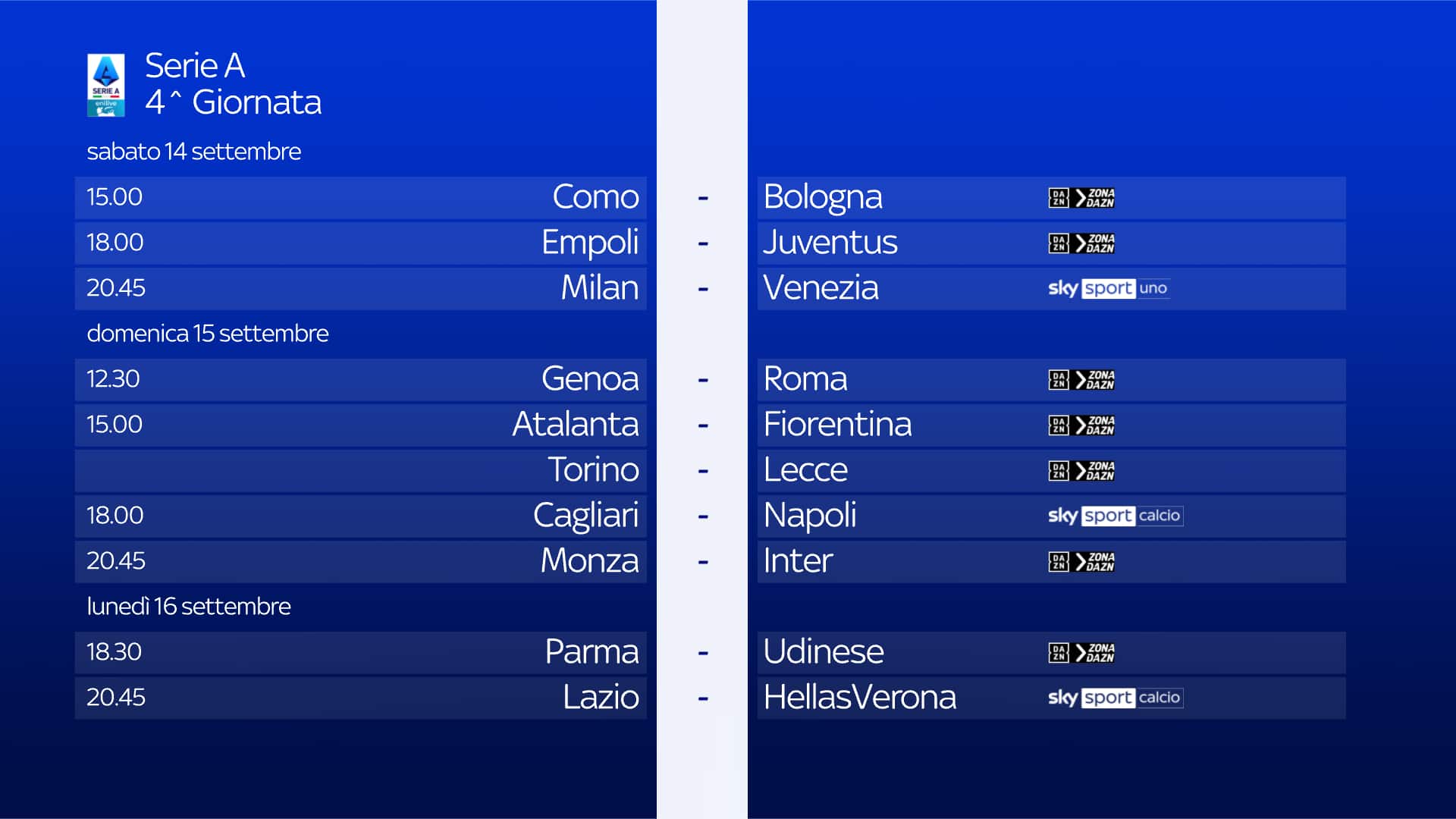 guida tvLa partita tra Empoli e Juventus della 4^ giornata si gioca sabato 14 settembre alle 18 e sarà in diretta sull'app di DAZN e sul canale DAZN, disponibile al canale 214 del telecomando Sky