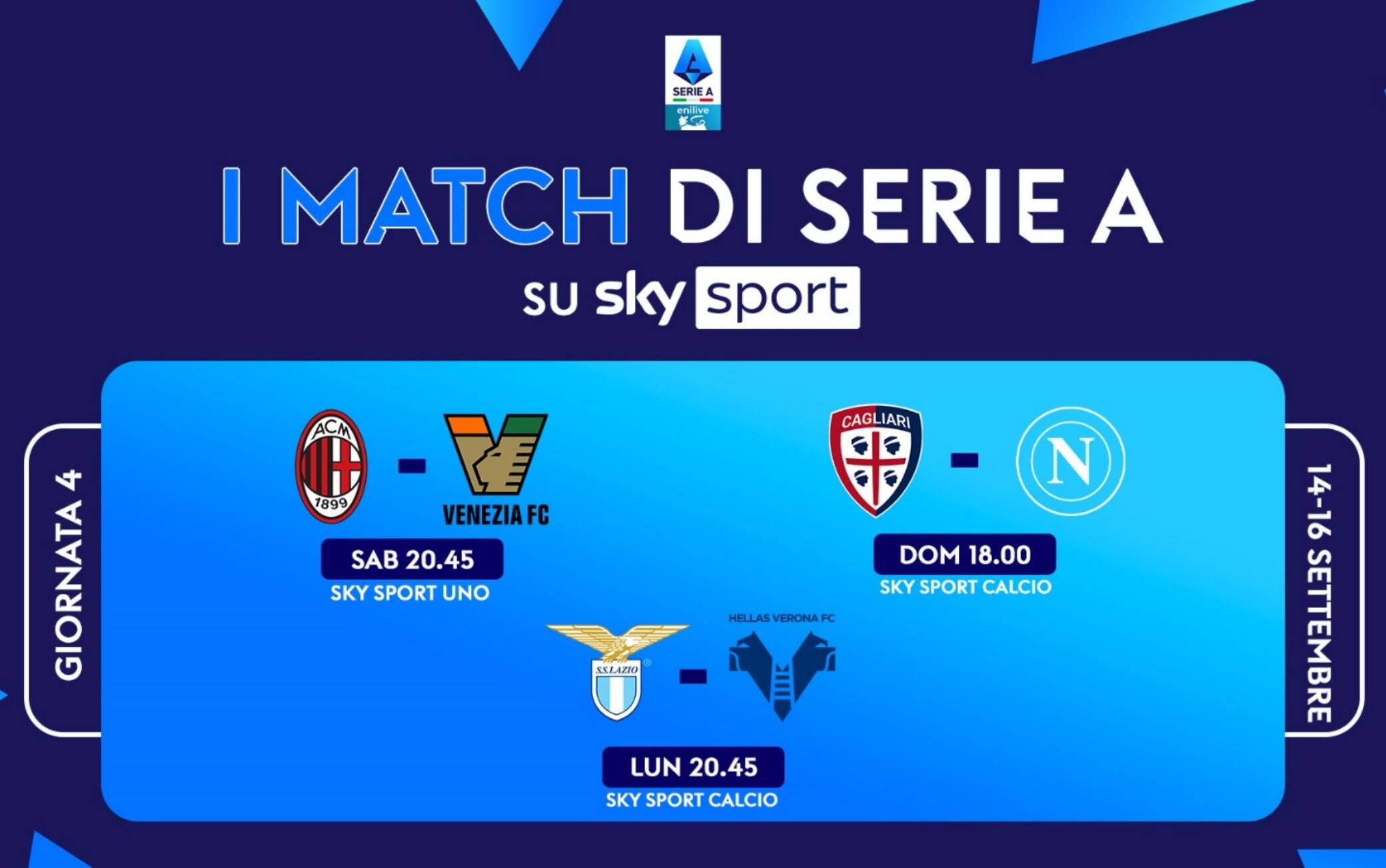 La partita tra Cagliari-Napoli, valida per la 4^ giornata di Serie A, sarà trasmessa domenica 15 settembre alle 18.00 su Sky Sport Calcio, Sky Sport 4K, Sky Sport 252 e in streaming su NOW. La telecronaca è affidata a Riccardo Gentile, con commento di Blerim Dzemaili. A bordocampo Valentina Caruso e Massimo Ugolini. Dalle 15.30 appuntamento con 'Sunday Football', in studio: Leo Di Bello, Marco Bucciantini, Walter Zenga e Maurizio Compagnoni.