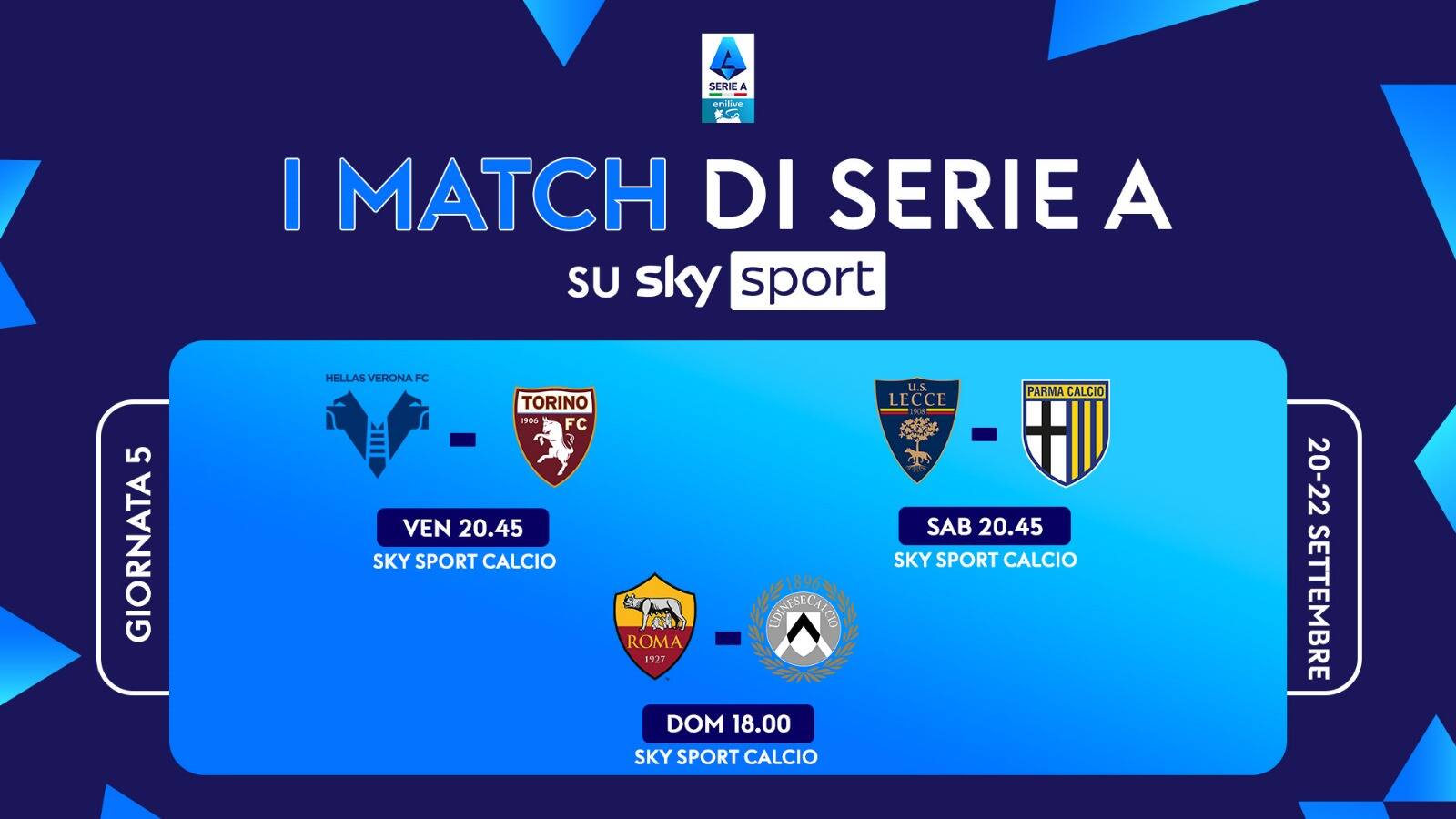 Il quinto turno di Serie A si gioca da venerdì 20 a lunedì 23 settembre. Le 3 partite in diretta su Sky e in streaming su NOW saranno: Verona-Torino, Lecce-Parma e Roma-Udinese. La giornata di campionato inizia venerdì alle 18.30 con Cagliari-Empoli, mentre l’anticipo serale, alle 20.45, sarà Verona-Torino, in diretta su Sky Sport Calcio, Sky Sport 251 e in streaming su NOW. Sono tre gli appuntamenti del sabato. Si parte alle 15.00 con Venezia-Genoa e si prosegue alle 18.00 con la sfida Juventus-Napoli. La sera, alle 20.45, è la volta di Lecce-Parma su Sky Sport Calcio, Sky Sport Uno, Sky Sport 4K, Sky Sport 251 e in streaming su NOW. La domenica si apre alle 12.30 con Fiorentina-Lazio e prosegue, alle 15.00, con Monza-Bologna e alle 18.00 Roma-Udinese, in diretta su Sky Sport Calcio, Sky Sport 4K, Sky Sport 251 e in streaming su NOW. La sera, alle 20.45, è tempo di derby con Inter-Milan. La giornata di campionato si conclude lunedì 23 settembre, alle 20.45, con Atalanta-Como.