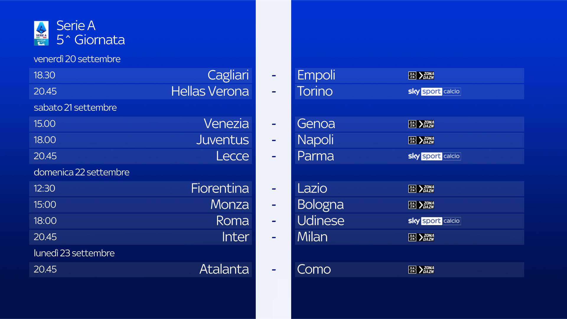 guida tvLa partita tra Venezia e Genoa della 5^ giornata si gioca sabato 21 settembre alle 15 e sarà in diretta sull'app di DAZN e sul canale DAZN, disponibile al canale 214 del telecomando Sky