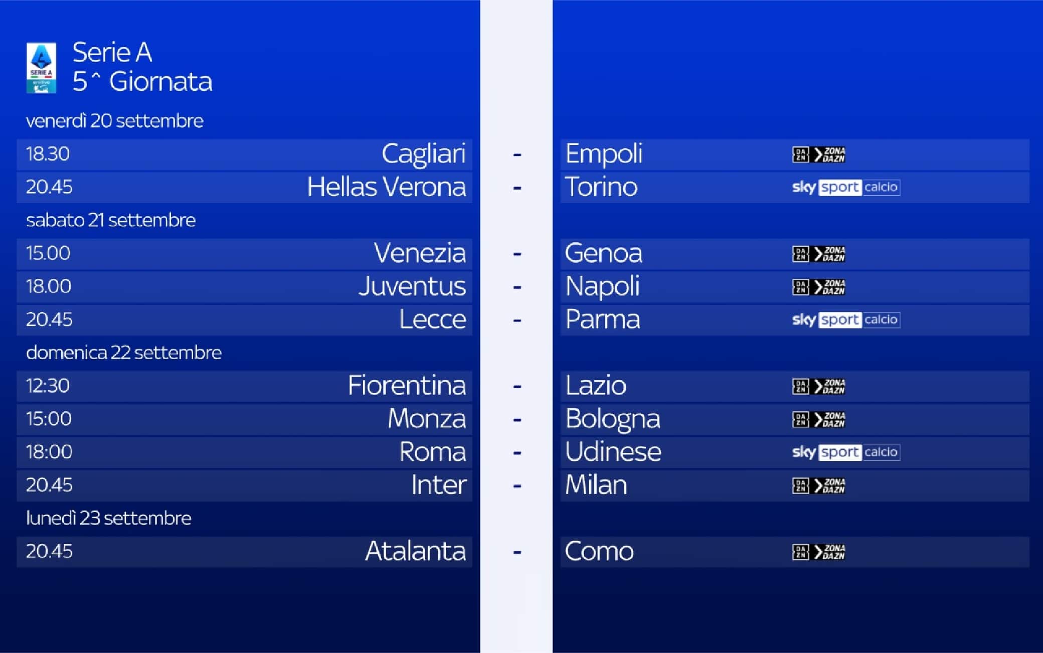 guida tvLa partita tra Inter e Milan della 5^ giornata si gioca domenica 22 settembre alle 20.45 e sarà in diretta sull'app di DAZN e sul canale DAZN, disponibile al canale 214 del telecomando Sky