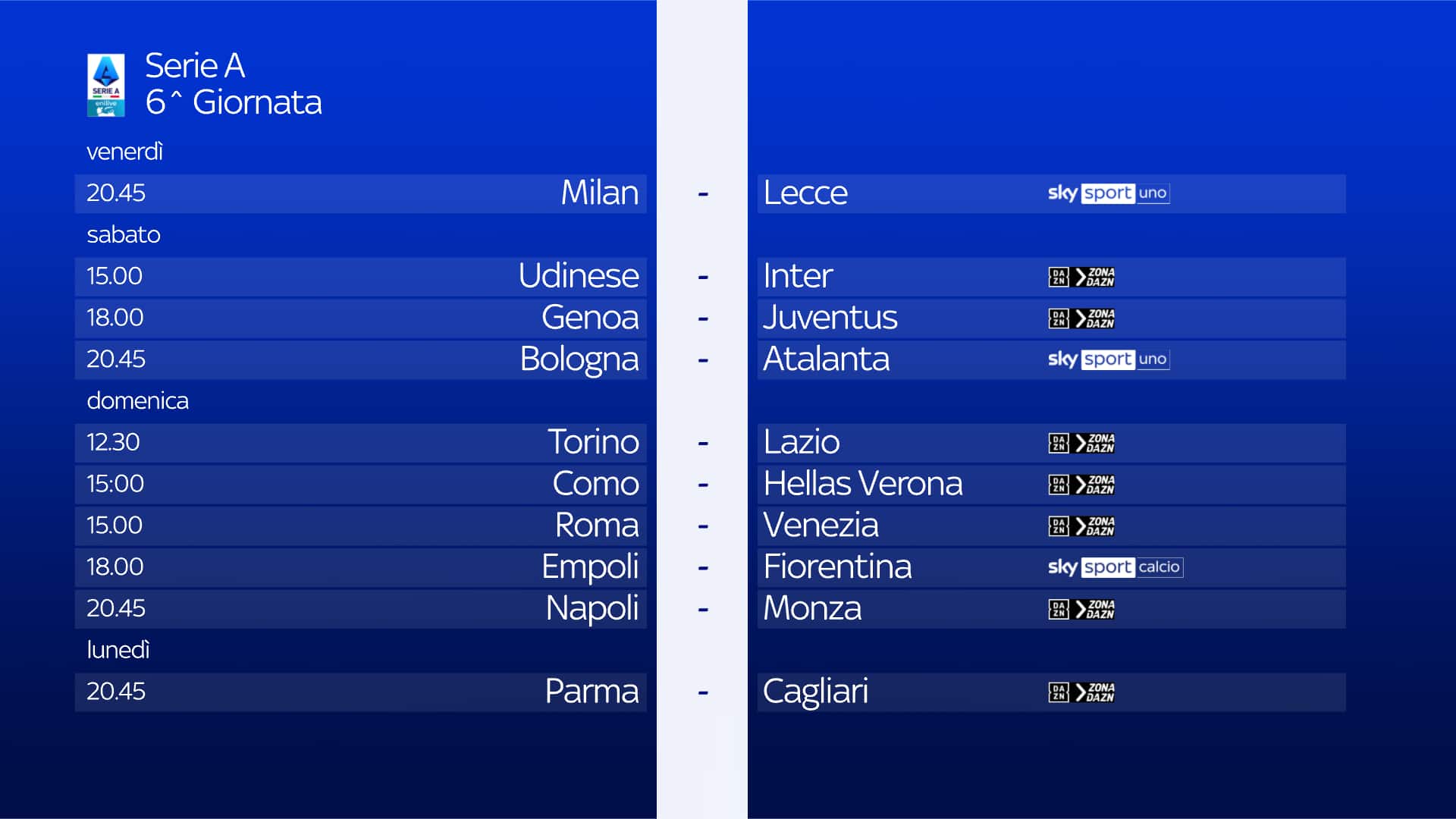 guida tvLa partita tra Udinese e Inter della 6^ giornata si gioca sabato 28 settembre alle 15 e sarà in diretta sull'app di DAZN e sul canale DAZN, disponibile al canale 214 del telecomando Sky
