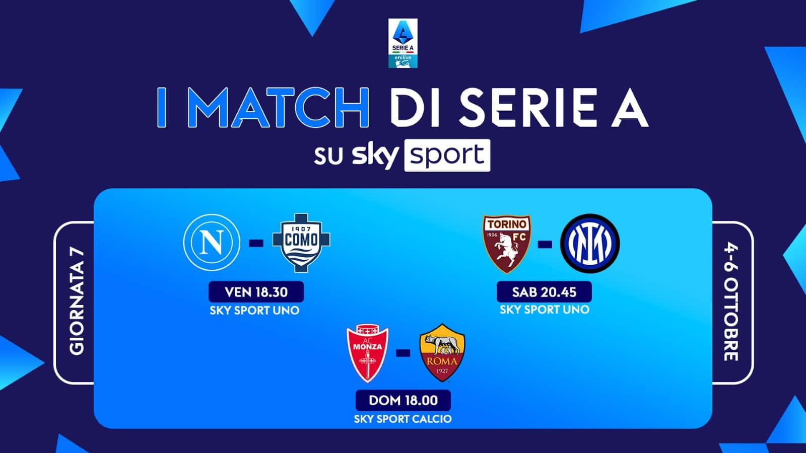 Il settimo turno di Serie A si gioca da venerdì 4 a domenica 6 ottobre. Le 3 partite in diretta su Sky e in streaming su NOW saranno: Napoli-Como, Inter-Torino e Monza-Parma. La giornata di campionato inizia venerdì alle 18.30 con Napoli-Como, in diretta su Sky Sport Calcio, Sky Sport Uno, Sky Sport 251 e in streaming su NOW. La sera, alle 20.45, il derby veneto Verona-Venezia. Sono poi tre gli appuntamenti del sabato. Si parte alle 15.00 con Udinese-Lecce e si prosegue alle 18.00 con la sfida Atalanta-Genoa. La sera, alle 20.45, è la volta Inter-Torino su Sky Sport Calcio, Sky Sport UNO, Sky Sport 4K, Sky Sport 251 e in streaming su NOW. La domenica si apre alle 12.30 con Juventus-Cagliari e prosegue, alle 15.00, con un doppio appuntamento: Bologna-Parma e Lazio-Empoli. Alle 18.00 è la volta di Monza-Parma, in diretta su Sky Sport Calcio, Sky Sport 4K, Sky Sport 251 e in streaming su NOW. La domenica sera si chiude la giornata di campionato prima della pausa per le nazionali e alle 20.45 scendono in campo Fiorentina e Milan.
