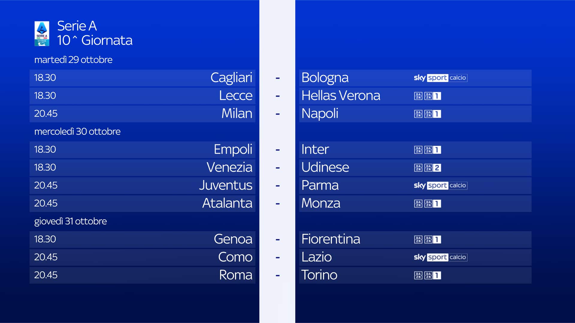 guida tvLa partita tra Milan e Napoli si gioca martedì 29 ottobre alle 20.45 e sarà in diretta sulla app di DAZN e sul canale DAZN, disponibile al canale 214 del telecomando Sky