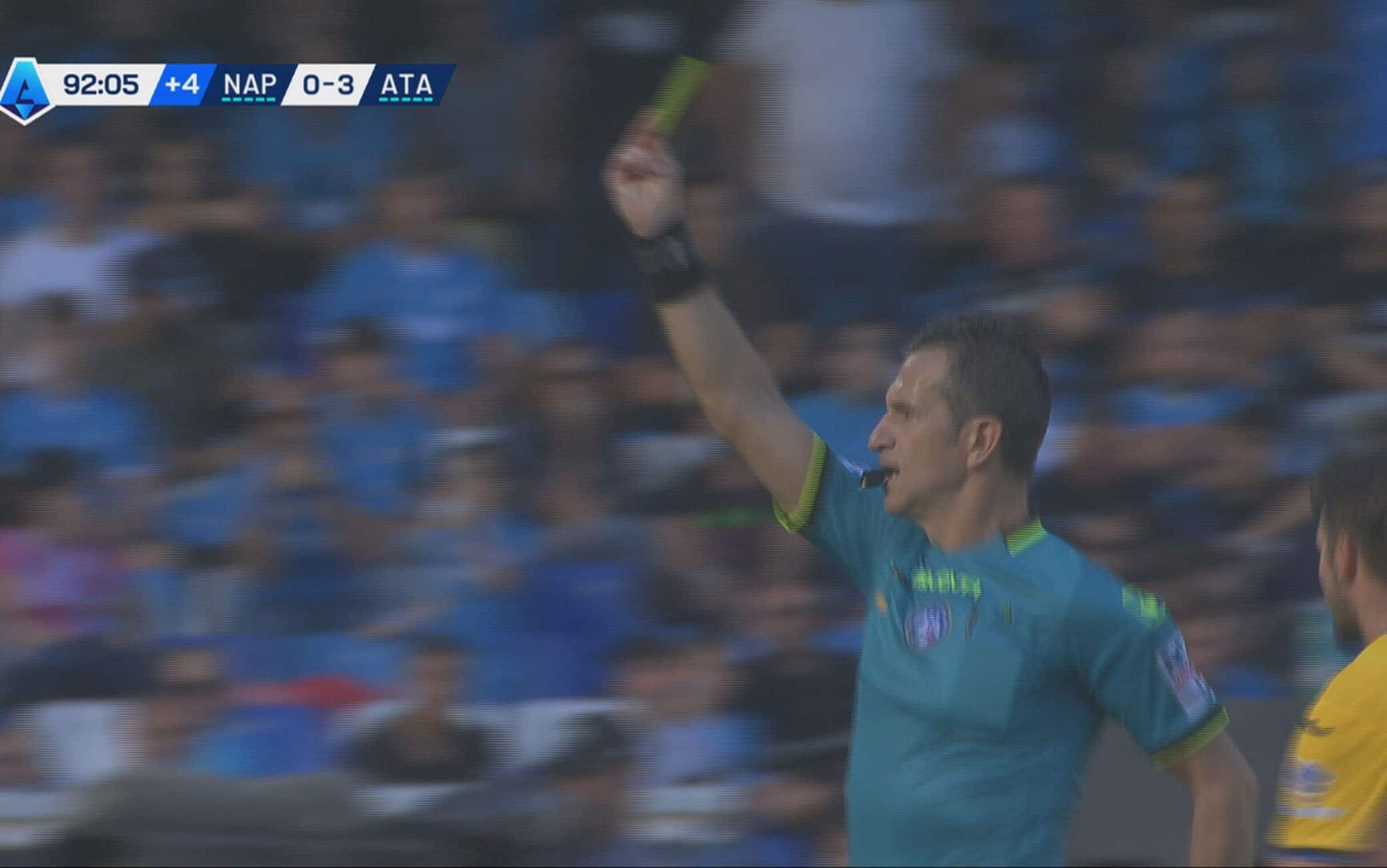 Episodio curioso accaduto nel finale di Napoli-Atalanta, sfida vinta 3-0 dai nerazzurri sul campo della capolista. Partita da applausi della squadra di Gasperini, che festeggia con la doppietta di Lookman e il gol nel recupero di Retegui. E proprio quanto accaduto dopo la rete di Mateo Retegui ha sorpreso tutti. L'attaccante della Nazionale, che al minuto 92 ha segnato il suo 11° gol in altrettante partite, si era tolto la maglia per la gioia. Un'esultanza che, da regolamento, viene sanzionata con l'ammonizione. Ma nel comunicato del giudice sportivo non c'è traccia del provvedimento nei confronti di Retegui. Eppure nella diretta televisiva non era passato inosservato l'arbitro Daniele Doveri che, cartellino alla mano, puniva un comportamento non regolamentare. Ma quel cartellino non era per Retegui. Che cosa è successo?