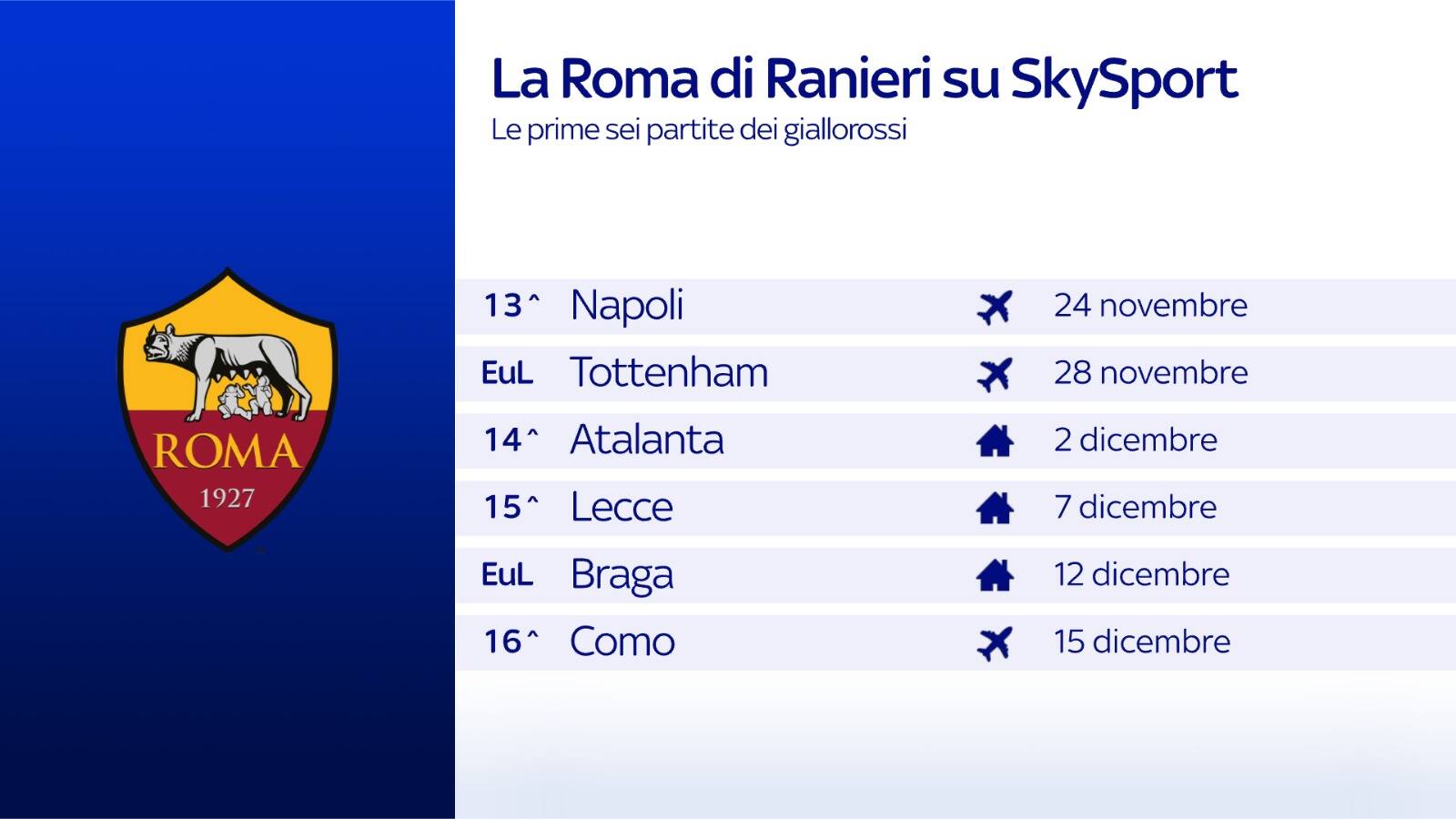Le partite della Roma di Ranieri da non perdere su Sky e in streaming su NOW a novembre e dicembre: ben sei le gare dei giallorossi tra Serie A ed Europa League (contro Napoli, Tottenham, Atalanta, Lecce, Braga e Como)