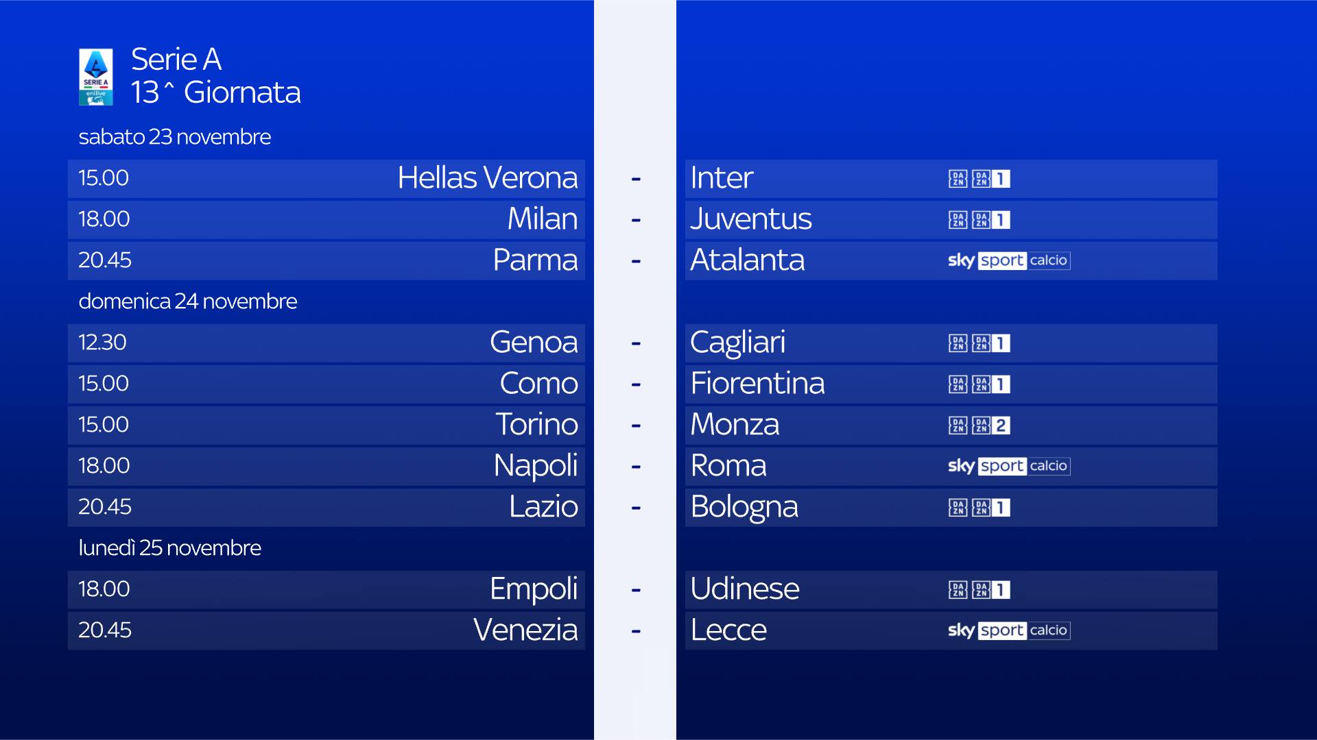 guida tvLa partita tra Hellas Verona e Inter, della 13^ giornata di Serie A, si gioca sabato 23 novembre alle 15 e sarà in diretta sulla app di DAZN e sul canale DAZN, disponibile al canale 214 del telecomando Sky
