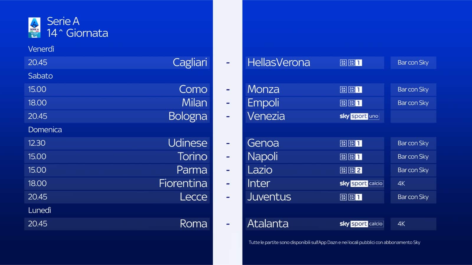 Sono tre gli appuntamenti del sabato della 14^ giornata di campionato. Alle 15.00 Como-Monza, alle 18.00 Milan-Empoli e la sera, alle 20.45, Bologna-Venezia, in diretta su Sky Sport Calcio, Sky Sport Uno, Sky Sport 251 e in streaming su NOW. Telecronaca di Riccardo Gentile con il commento di Blerim Dzemaili. I collegamenti a bordocampo sono a cura di Marco Nosotti e Marina Presello.