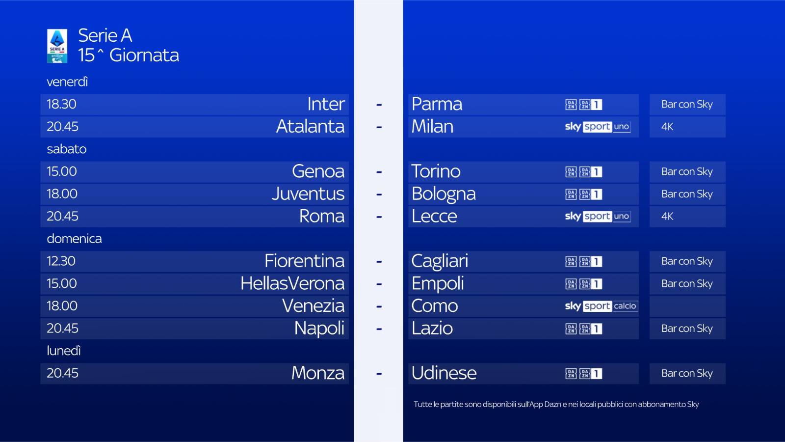 Sono tre gli appuntamenti del sabato del quindicesimo turno di campionato. Si inizia alle 15.00 con Genoa-Torino, alle 18.00 Juventus-Bologna e la sera, alle 20.45, Roma-Lecce, in diretta su Sky Sport Calcio, Sky Sport Uno, Sky Sport 4K, Sky Sport 251 e in streaming su NOW. Telecronaca di Riccardo Gentile con il commento di Lorenzo Minotti. I collegamenti a bordocampo sono a cura di Paolo Assogna e Angelo Mangiante.
