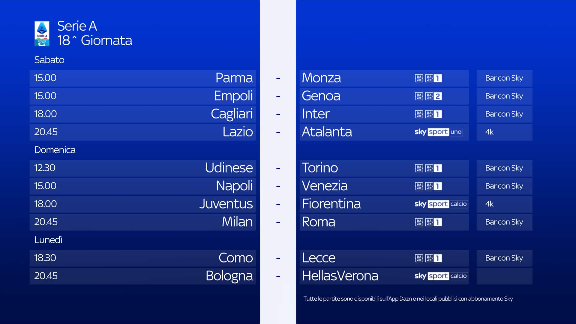 guida tvLa partita tra Napoli e Venezia della 18^ giornata di Serie A, si gioca domenica 29 dicembre alle ore 15 e sarà in diretta sulla app di DAZN e sul canale DAZN, disponibile al canale 214 del telecomando Sky