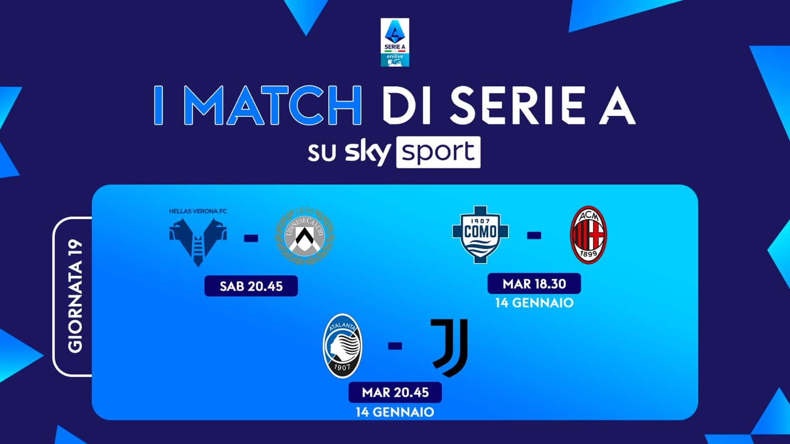 La partita Hellas Verona-Udinese, valida per la 19^ giornata di Serie A, sarà trasmessa sabato 4 gennaio alle ore 20.45 su Sky Sport Uno, Sky Sport Calcio, Sky Sport 251 e in streaming su NOW. Telecronaca di Dario Massara, commento di Massimo Gobbi. A bordocampo Marco Nosotti e Marina Presello. Dalle 20 e dalle 23 spazio a 'Casa dello Sport Night'. In studio: Sara Benci in compagnia di Stefano Borghi, Fabio Quagliarella, Gianfranco Teotino.