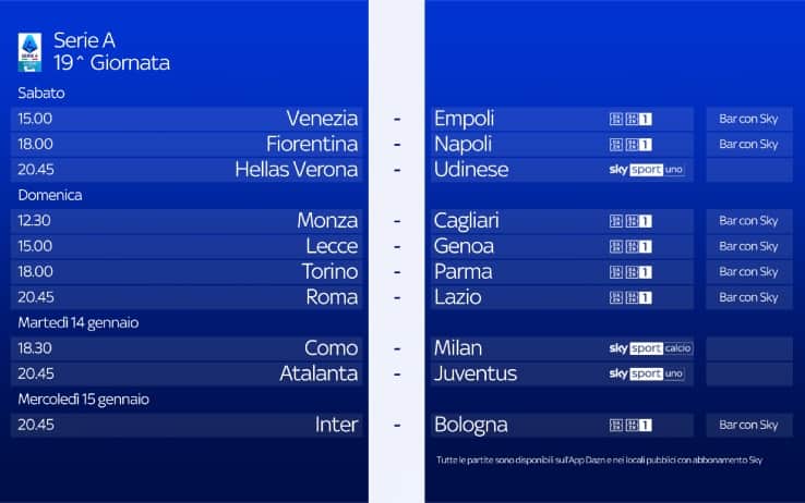 Le partite di Serie A di oggi, il calendario e gli orari della 19^ giornata