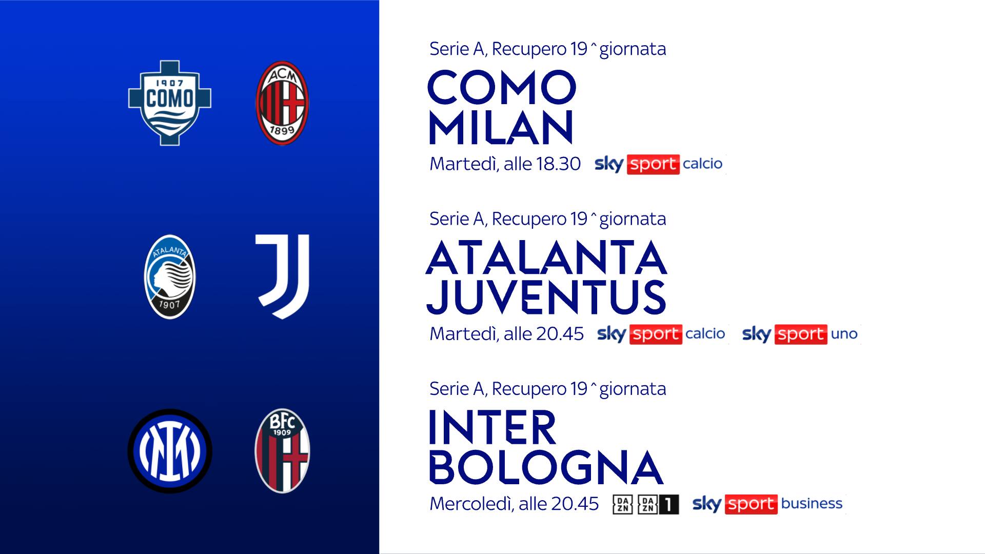 guida tvLa partita tra Atalanta e Juventus, recupero della 19^ giornata di Serie A si gioca martedì 14 gennaio alle ore 20.45 e sarà trasmessa in diretta su Sky Sport Uno, Sky Sport Calcio, Sky Sport 251, Sky Sport 4K e in streaming su NOW