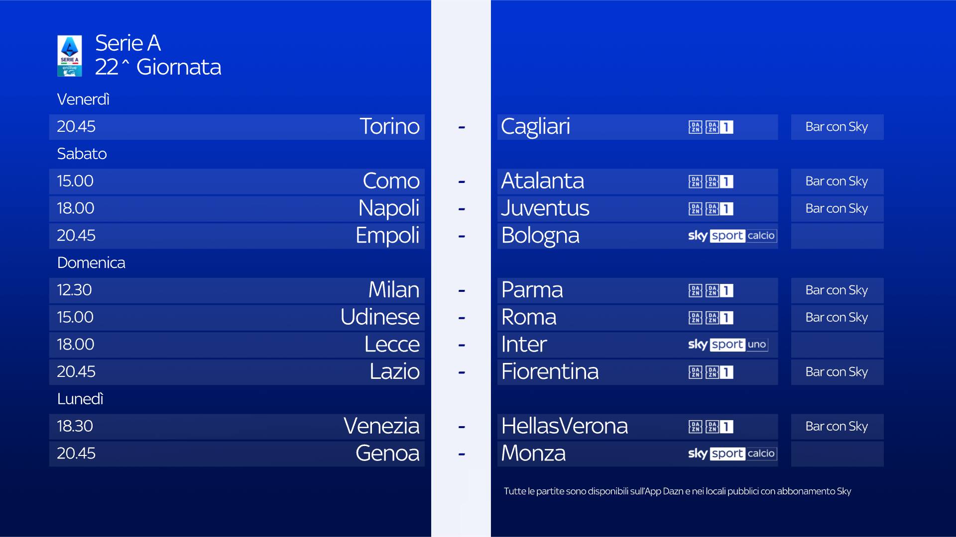 Le 10 partite di ogni turno di Serie A sono visibili anche in tutti i locali con abbonamento Sky, scopri il più vicino su sky.it/trovabar.