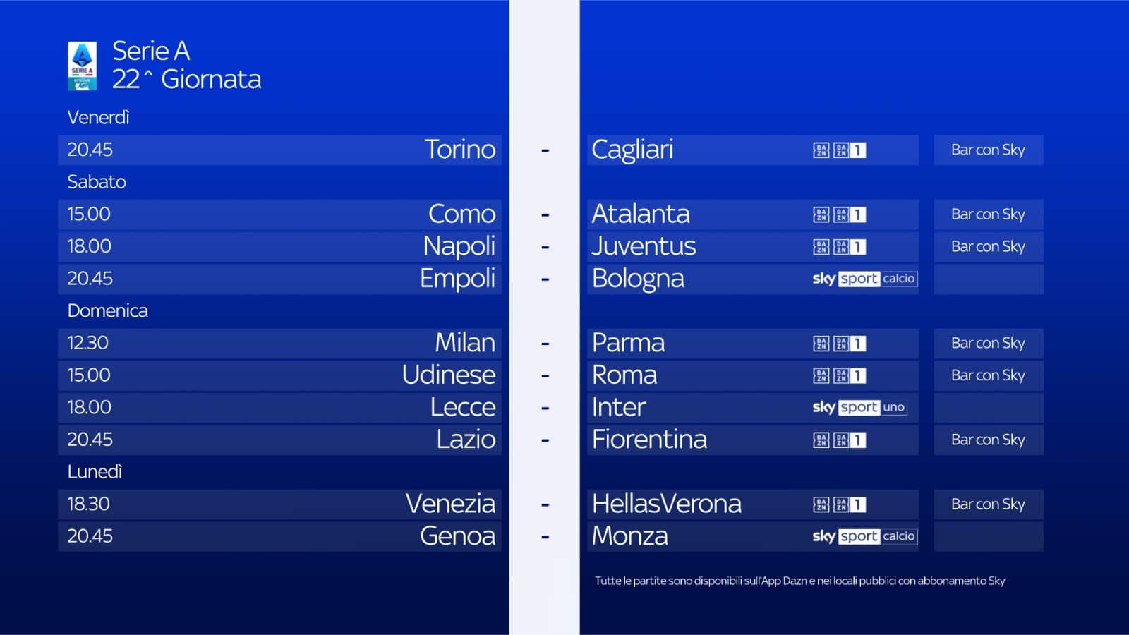 Le partite di Serie A di oggi, il calendario e gli orari della 22^ giornata