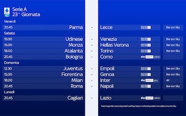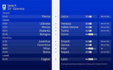 Venerdì 31 gennaio saranno definiti i sorteggi di Champions ed Europa League e di conseguenza la Lega serie A definirà anche anticipi e posticipi delle prossime giornate. Saranno definite anche le date dei recuperi, Fiorentina-Inter, fermata al 17' per il malore occorso a Edoardo Bove, e Bologna-Milan, rinviata per il maltempo. La prima si dovrebbe giocare il 6 febbraio e la seconda il 26 febbraio