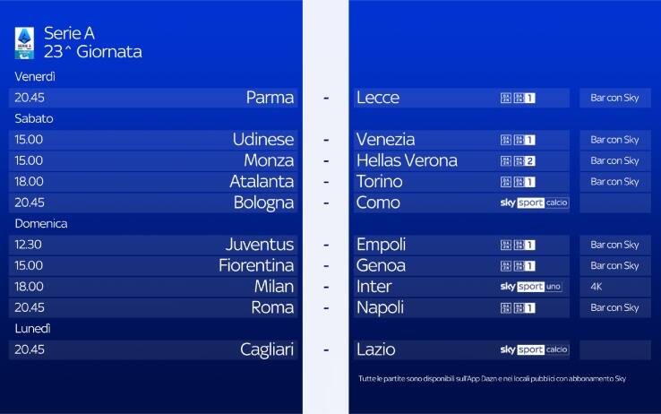Le partite di Serie A di oggi, il calendario e gli orari della 23^ giornata
