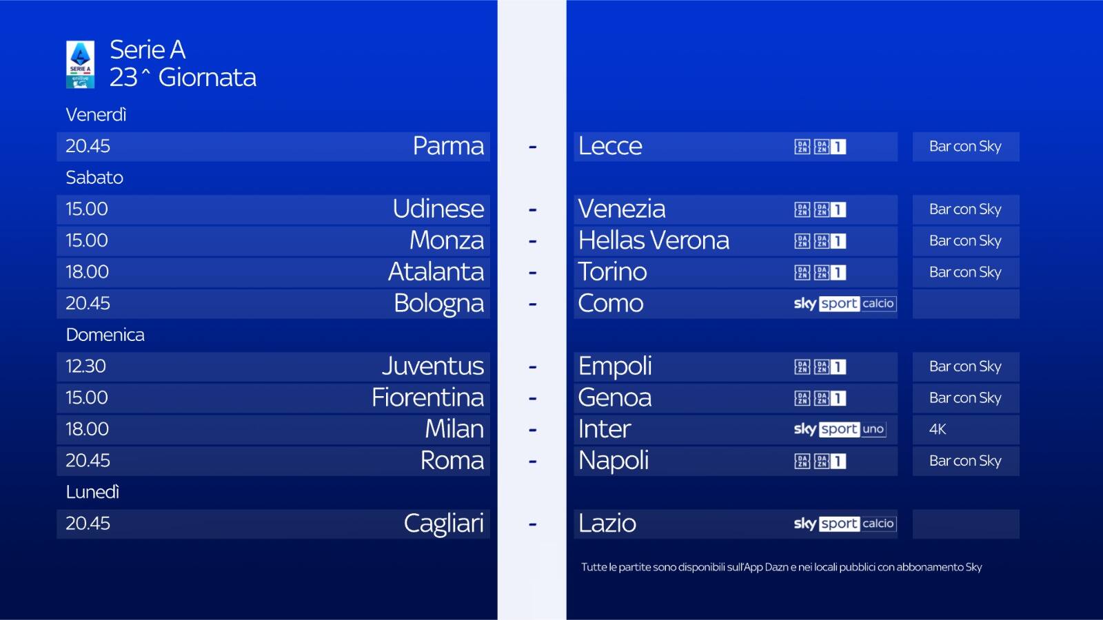 Le 10 partite di ogni turno di Serie A sono visibili anche in tutti i locali con abbonamento Sky, scopri il più vicino su sky.it/trovabar.