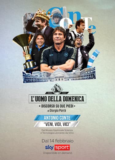 Il nuovo capitolo de “L’Uomo della Domenica”, la Produzione Originale Sky Sport firmata da Giorgio Porrà (disponibile on demand su Sky), è dedicato ad Antonio Conte: l’uomo che coinvolge e sconvolge per leadership dominante, potenza del messaggio, attitudine a creare dipendenza in chi ne sposa la visione, puntando al costante superamento dei limiti