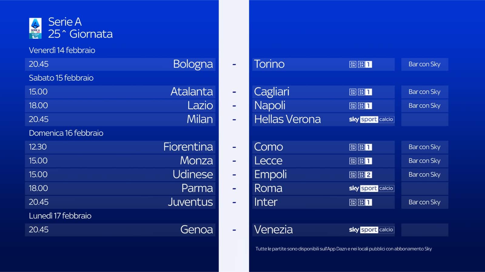 guida tvDa venerdì 14 a lunedì 17 febbraio su Sky e in streaming su NOW la 25^ giornata, con 3 gare in co-esclusiva: Milan-Verona, Parma-Roma e Genoa-Venezia. Pre e postpartita live per ogni singolo match, inviati su tutti i campi, le rubriche e gli studi di Sky Sport. Aggiornamenti live su Sky Sport 24, SkySport.it e i canali social di Sky Sport