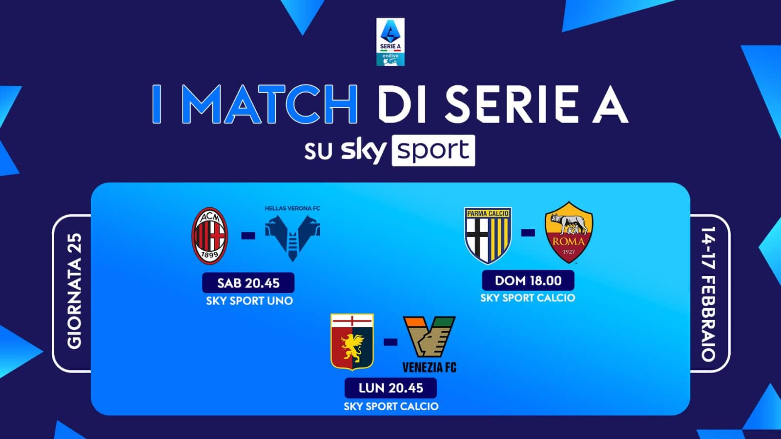 La partita Milan-Hellas Verona, valida per la 25^ giornata di Serie A, sarà trasmessa sabato 15 febbraio alle ore 20.45 su Sky Sport Calcio, Sky Sport Uno, Sky Sport 251, Sky Sport 4K e in streaming su NOW. Telecronaca di Riccardo Gentile, commento di Massimo Gobbi. A bordocampo Peppe Di Stefano e Emanuele Baiocchini. Dalle ore 20 e dalle 22.40 spazio a 'L'Originale'. In studio: Alessandro Bonan in compagnia di Gianluca Di Marzio, Veronica Baldaccini, Paolo Condò e Alessandro Costacurta.