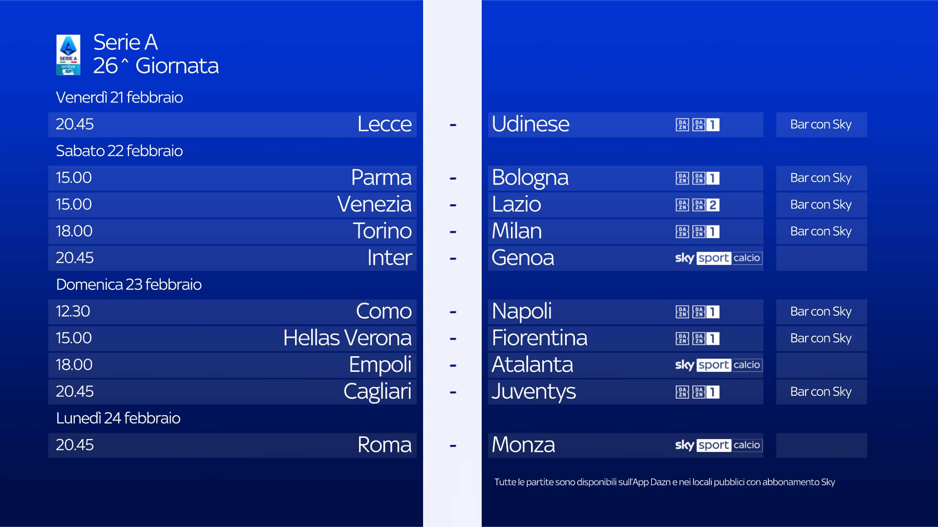 Le 10 partite di ogni turno di Serie A sono visibili anche in tutti i locali con abbonamento Sky, scopri il più vicino su sky.it/trovabar.