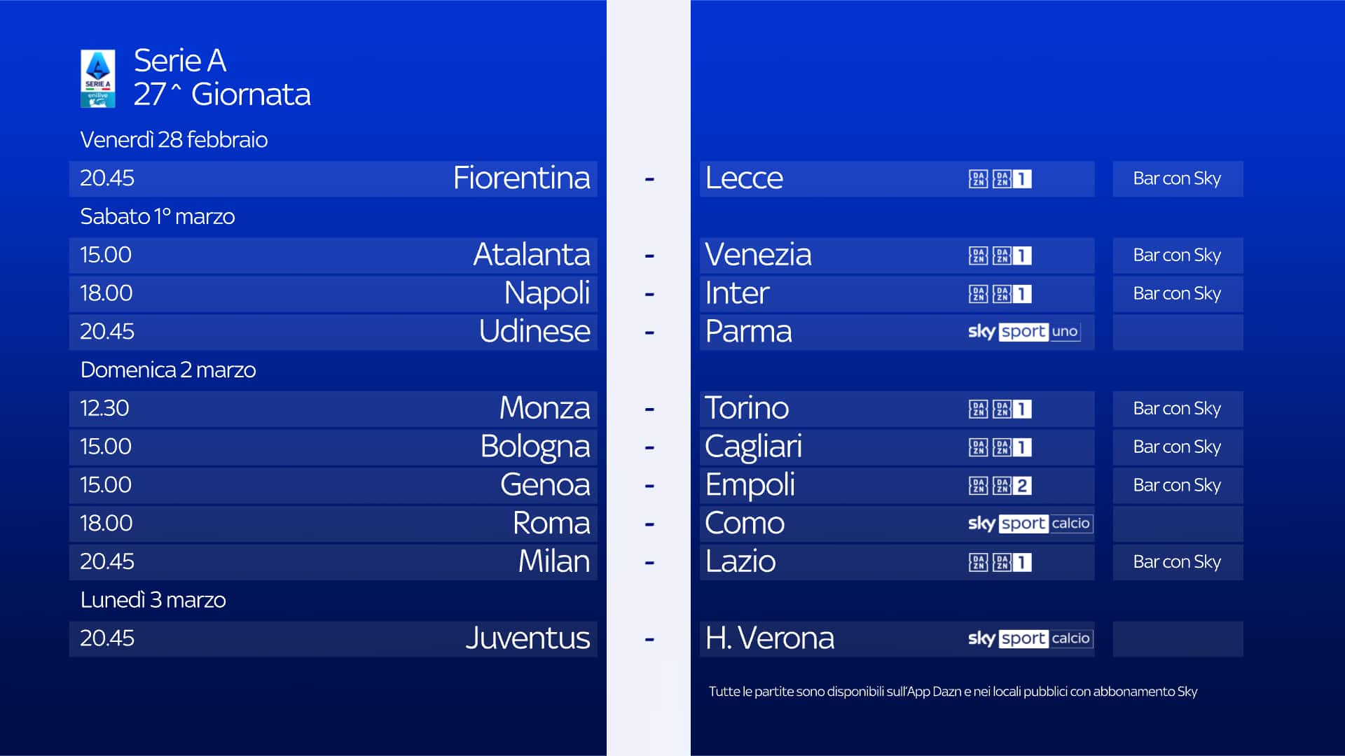 La partita Napoli-Inter della 27^ giornata di Serie A sarà trasmessa sabato 1° marzo alle ore 18 in diretta sull'app di DAZN, disponibile nella sezione App di Sky Q, Sky Stream e Sky Glass. Gli abbonati Sky Q (via satellite o via internet) e Sky Glass che sono anche clienti DAZN, potranno accedere all'offerta DAZN anche col controllo vocale, tramite il comando "Apri DAZN", comodamente in unico posto e con un unico dispositivo. Su Sky Q (via satellite) e My Sky, la partita è visibile anche sul canale DAZN, disponibile al numero 214 del telecomando Sky. Per vedere il canale DAZN, i clienti DAZN devono aderire ad una specifica opzione disponibile all’interno dell'area "il mio account" su dazn.com. Per abbonarsi a DAZN ed attivare l’opzione per vedere il canale DAZN su Sky Q o My Sky, è necessario andare su dazn.com/sky e seguire le indicazioni per la sottoscrizione.