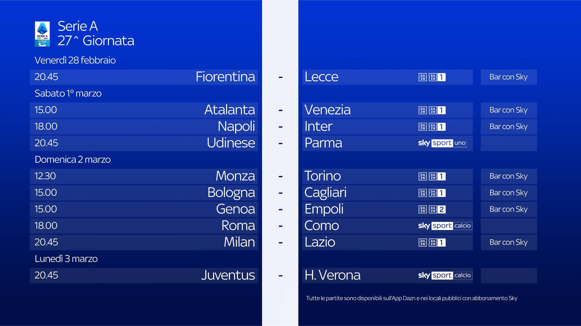 Le 10 partite di ogni turno di Serie A sono visibili anche in tutti i locali con abbonamento Sky, scopri il più vicino su sky.it/trovabar.