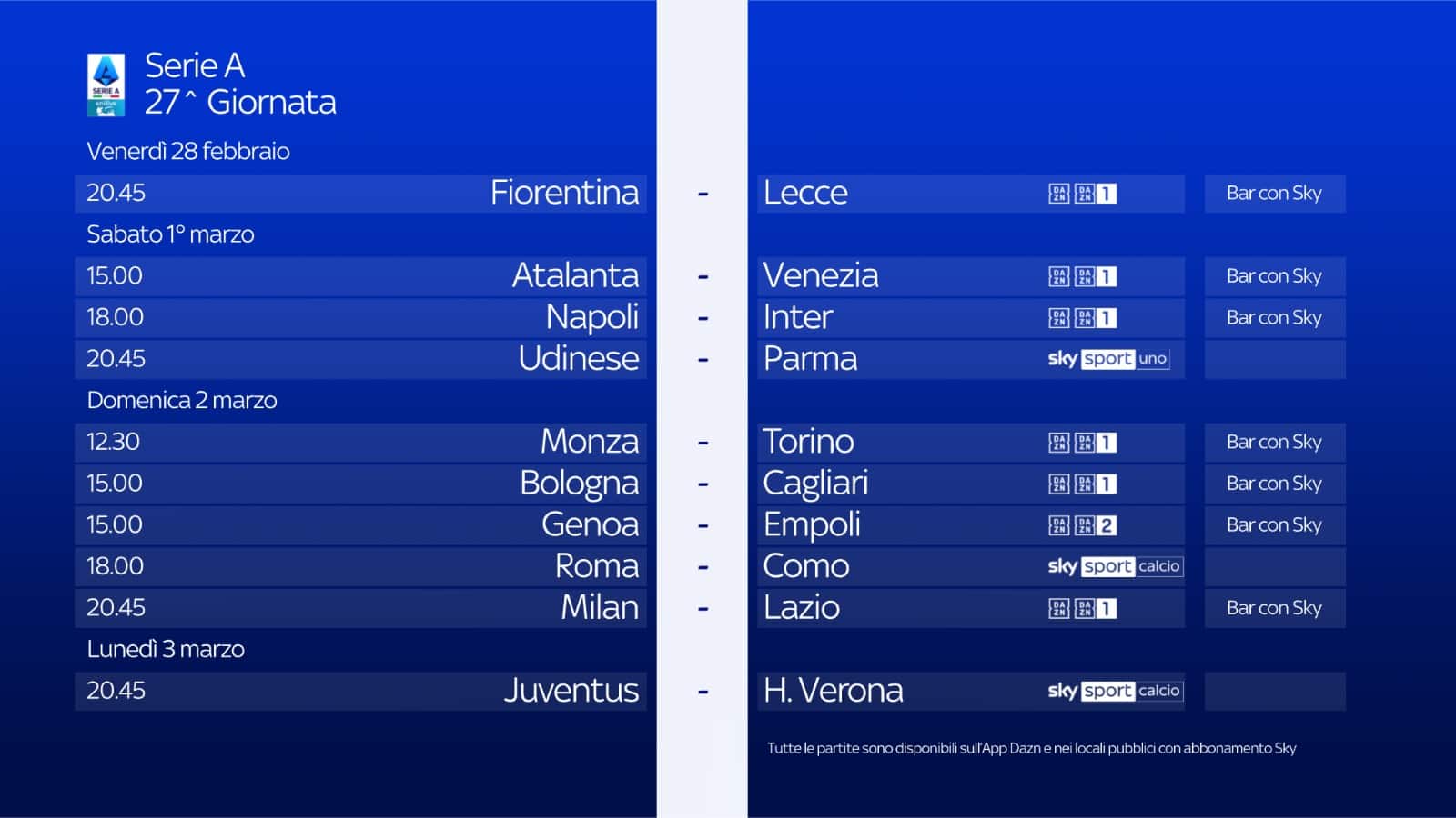 - ore 20.45: Milan-Lazio su DAZN 1