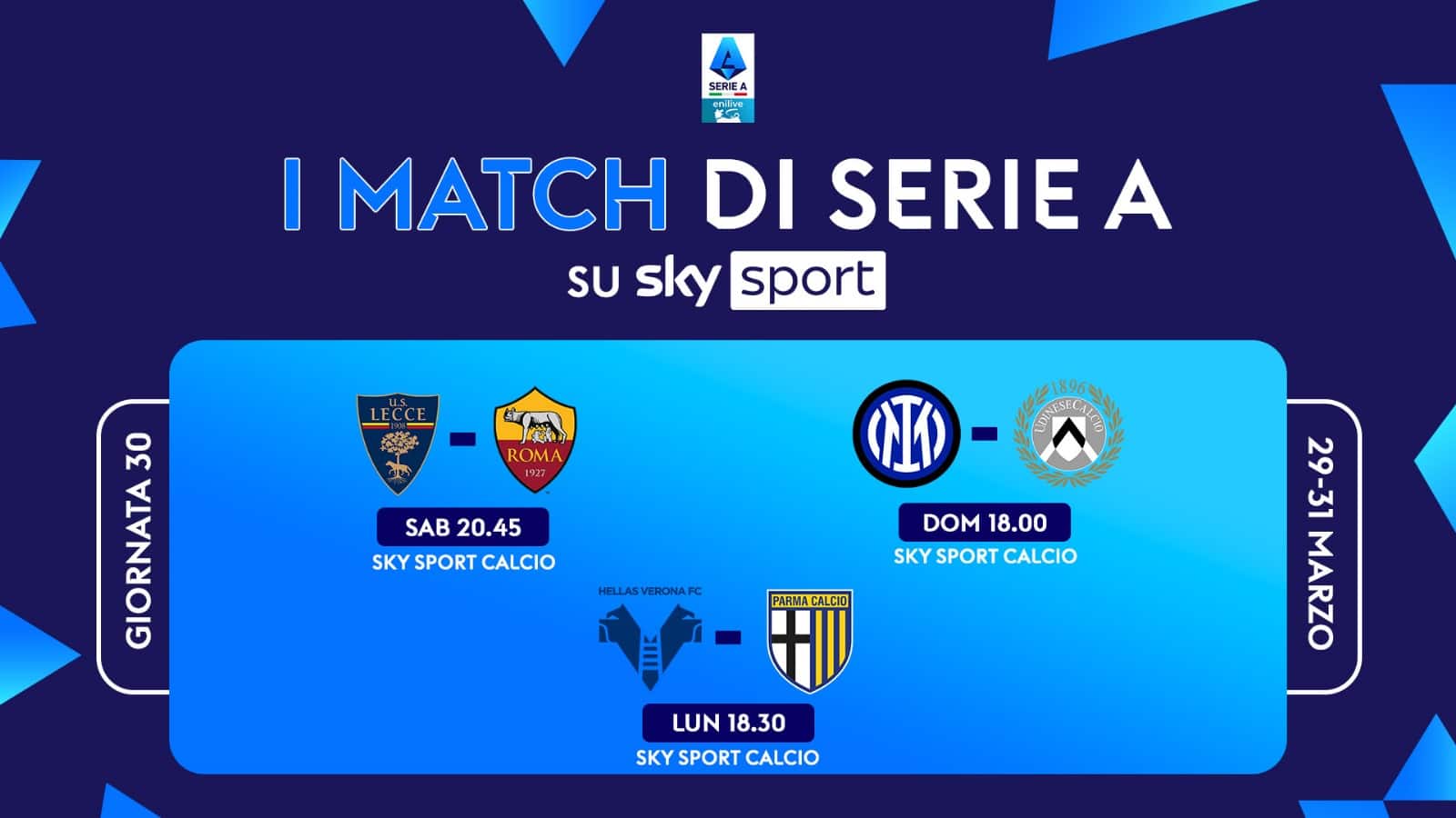Il trentesimo turno di Serie A si gioca da sabato 29 a lunedì 31 marzo. Le 3 partite in diretta su Sky e in streaming su NOW saranno: Lecce-Roma, Inter-Udinese e Verona-Parma. La giornata di campionato, inizia sabato 29 con un doppio appuntamento alle 15.00: Venezia-Bologna e Como-Empoli, alle 18.00 è il momento di Juventus-Genoa, mentre la sera, alle 20.45, scendono in campo Lecce e Roma, su Sky Sport Calcio, Sky Sport 4K, Sky Sport 251 e in streaming su NOW. La domenica si apre alle 12.30 con Cagliari-Monza, seguono alle 15.00, Fiorentina-Atalanta e alle 18.00 Inter-Udinese, in diretta su Sky Sport Calcio, Sky Sport Uno, Sky Sport 4K, Sky Sport 251 e in streaming su NOW. La sera, alle 20.45, è la volta della sfida Napoli-Milan. La giornata di campionato si conclude lunedì 31 marzo con, alle 18.30, Verona-Parma in diretta su Sky Sport Calcio, Sky Sport 251 e in streaming su NOW e alle 20.45 Lazio-Torino.