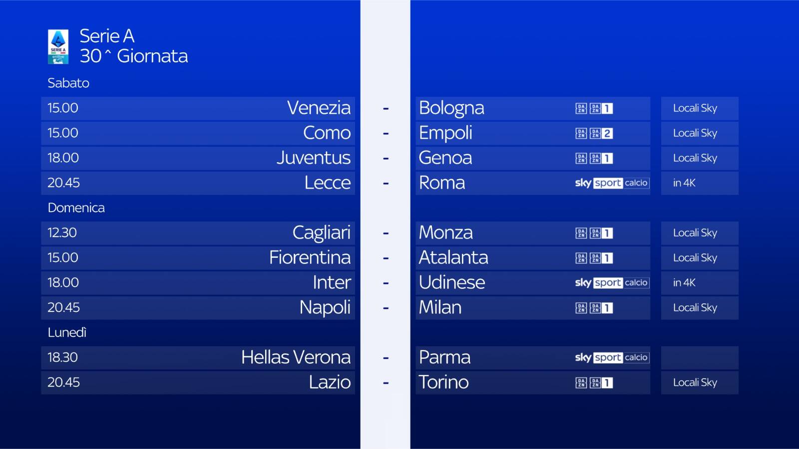 La 30^ giornata di campionato si conclude lunedì 31 marzo con, alle 18.30, Verona-Parma in diretta su Sky Sport Calcio, Sky Sport 251 e in streaming su NOW. Telecronaca di Davide Polizzi con il commento di Massimo Gobbi. I collegamenti a bordocampo sono a cura di Manuele Baiocchini e Marco Nosotti. Alle 20.45 Lazio-Torino.