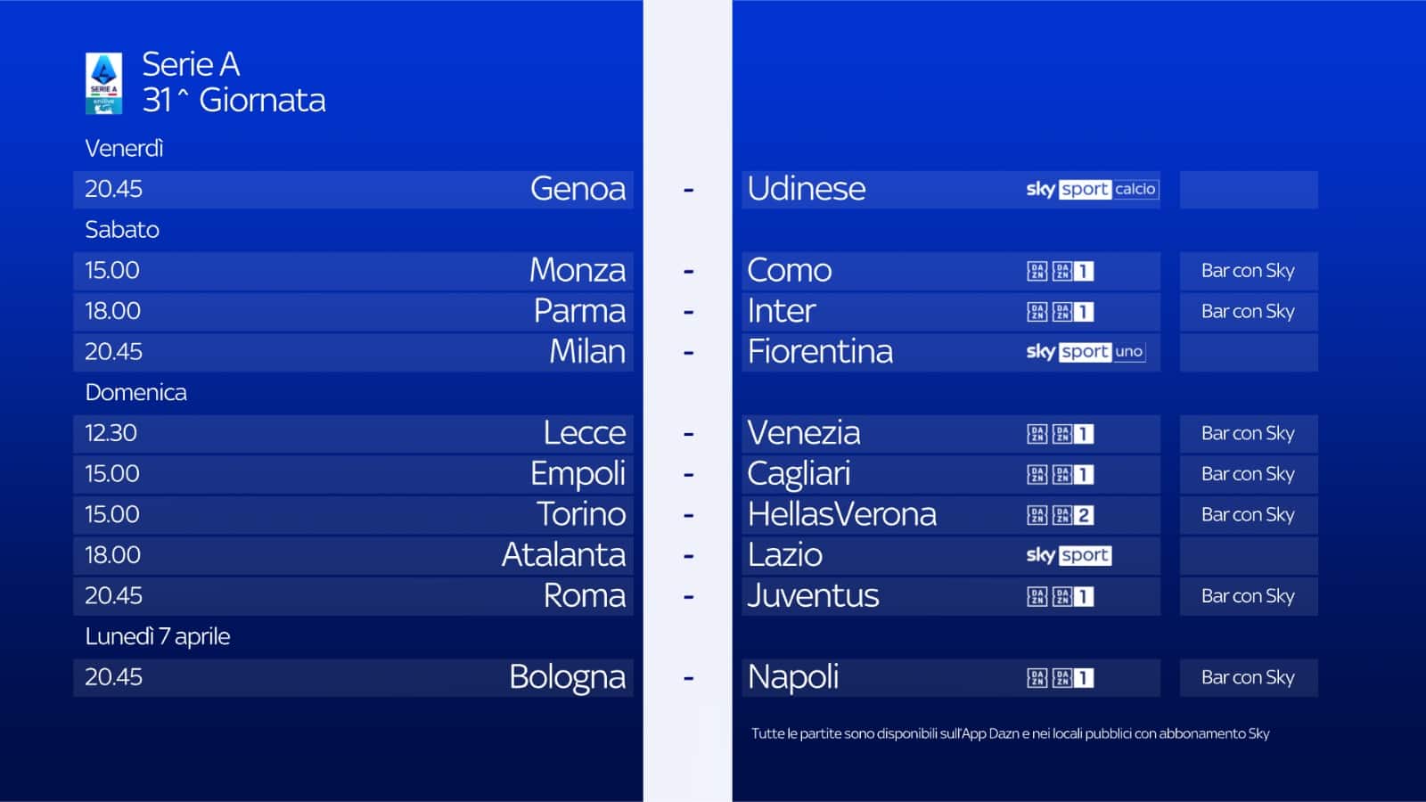 Sono tre gli appuntamenti del sabato della 31^ giornata di campionato. Si inizia alle 15.00 con Monza-Como, alle 18.00 è il momento di Parma-Inter, mentre la sera, alle 20.45, scendono in campo Milan e Fiorentina, su Sky Sport Calcio, Sky Sport Uno, Sky Sport 4K, Sky Sport 251 e in streaming su NOW. Telecronaca di Maurizio Compagnoni con il commento di Massimo Gobbi. I collegamenti a bordocampo sono a cura di Peppe Di Stefano e Vanessa Leonardi.