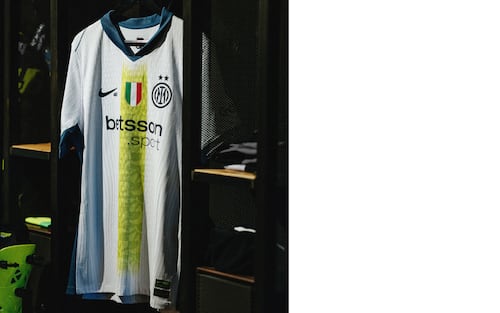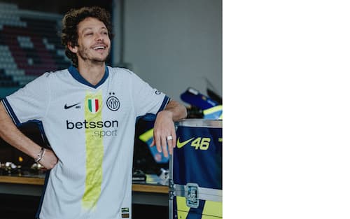 - Si tratta della classica maglia da trasferta di quest’anno arricchita però con elementi iconici della carriera di Valentino Rossi: in particolare, il celebre "Sole e Luna" è stato integrato nel cuore del design della maglia, a simboleggiare l’unione di due mondi e a e celebrare il legame speciale tra Rossi e l'Inter.