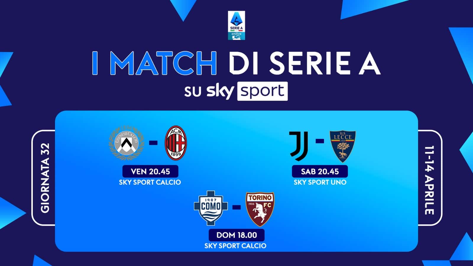 Il trentaduesimo turno di Serie A si gioca da venerdì 11 a lunedì 14 aprile. Le 3 partite in diretta su Sky e in streaming su NOW saranno: Udinese-Milan, Juventus-Lecce e Como-Torino. La giornata di campionato, inizia venerdì 11 aprile alle 20.45 con Udinese-Milan, in diretta su Sky Sport Calcio, Sky Sport 4K, Sky Sport 251 e in streaming su NOW. Sono tre gli appuntamenti del sabato. Si inizia alle 15.00 con Venezia-Monza alle 18.00 è il momento di Inter-Cagliari, mentre la sera, alle 20.45, scendono in campo Juventus e Lecce, su Sky Sport Calcio, Sky Sport Uno, Sky Sport 4K, Sky Sport 251 e in streaming su NOW. La domenica si apre alle 12.30 con Atalanta-Bologna, seguono alle 15.00, Fiorentina-Parma e Verona-genoa, alle 18.00 Como-Torino su Sky Sport Calcio, Sky Sport 251 e in streaming su NOW. La sera, alle 20.45, è tempo di derby con Lazio-Roma. La giornata di campionato si conclude lunedì 14 aprile, alle 20.45, con Napoli-Empoli.