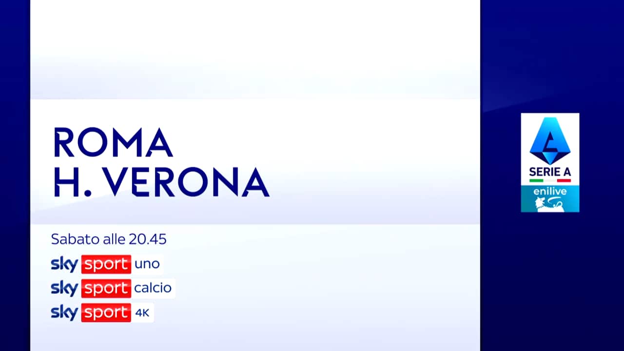 La partita Roma-Hellas Verona della 33^ giornata di Serie A sarà trasmessa sabato 19 aprile alle ore 20.45 in diretta su Sky Sport Uno, Sky Sport Calcio, Sky Sport 4K, Sky Sport 251 e in streaming su NOW. Telecronaca di Maurizio Compagnoni, commento di Lorenzo Minotti. A bordocampo Paolo Assogna e Angelo Mangiante. Dalle ore 20 e dalle 22.40 da non perdere 'L'Originale'. In studio: Alessandro Bonan con Gianluca Di Marzio, Veronica Baldaccini, Paolo Condò e Fabio Quagliarella.
