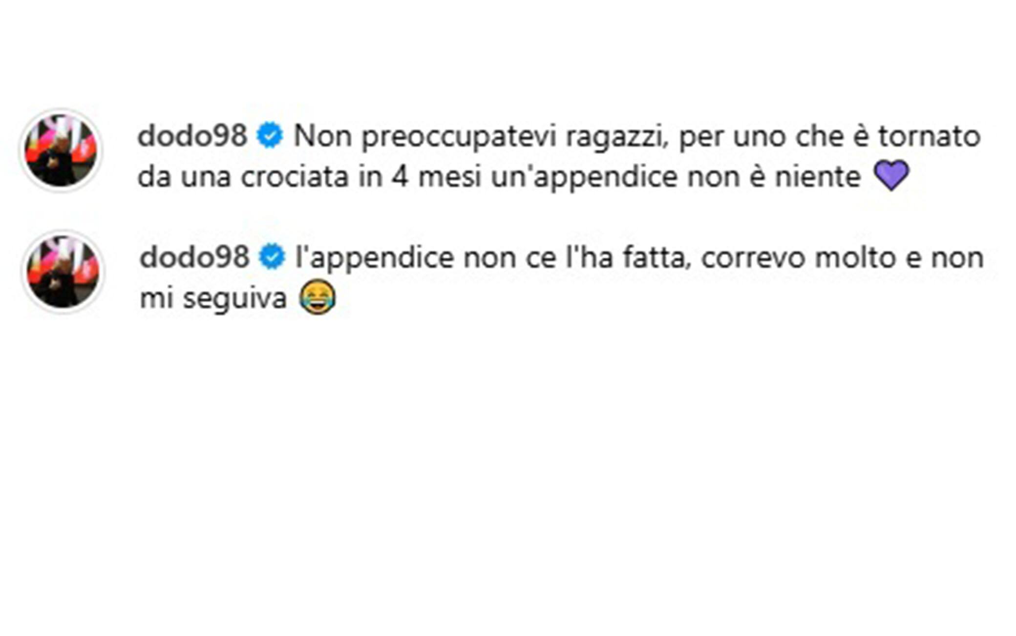 Attraverso la pagina Instagram 'Passione Fiorentina', lo stesso Dodò aveva sdrammatizzato rivolgendo un pensiero ai tifosi viola: "Non preoccupatevi ragazzi. Per uno che è tornato da un crociato in 4 mesi, un'appendicite non è niente". Puntualmente di buon umore, inoltre, il 26enne brasiliano ha scherzato con una battuta facendo riferimento alla sua velocità: "L'appendicite non ce l'ha fatta, correvo molto e non mi seguiva".