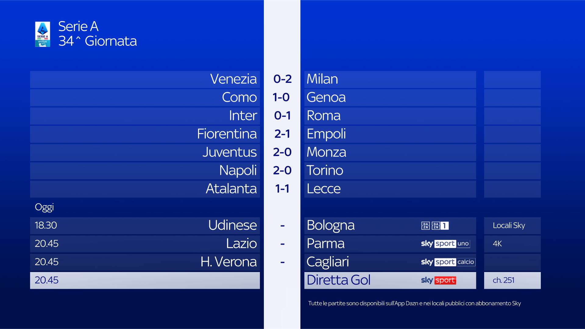 bordocampo Matteo Petrucci e Manuele Baiocchini; Diretta Gol Federico Zancan. Dalle 20 e dalle 22.40 appuntamento con Monday Night, in studio: Fabio Tavelli, Rachele Sangiuliano, Gianfranco Teotino e Stefano Borghi. Inoltre alle 20.45 da non perdere Diretta Gol su Sky Sport Calcio, Sky Sport 251 e NOW per seguire le due partite in contemporanea.