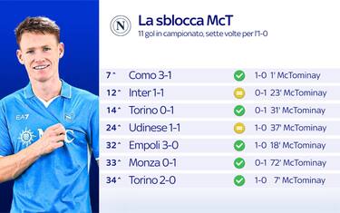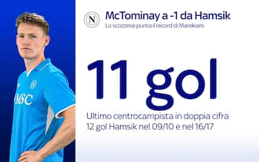 Sono diversi i record che McTominay sta battendo nel corso di questa stagione. Lo scozzese è arrivato lo scorso mercato estivo dal Manchester United. Per lui, dunque, si tratta della prima stagione in Serie A e con la maglia azzurra. Nessun centrocampista all'esordio nel campionato italiano con il Napoli (sotto l'era De Laurentiis) aveva raggiunto la doppia cifra. E prima di lui, nel corso di questi anni solo un altro centrocampista aveva segnato almeno 10 gol con il Napoli: parliamo di Marek Hamsik, che ha realizzato 12 gol nelle stagioni 2009/10 e 2016/17.