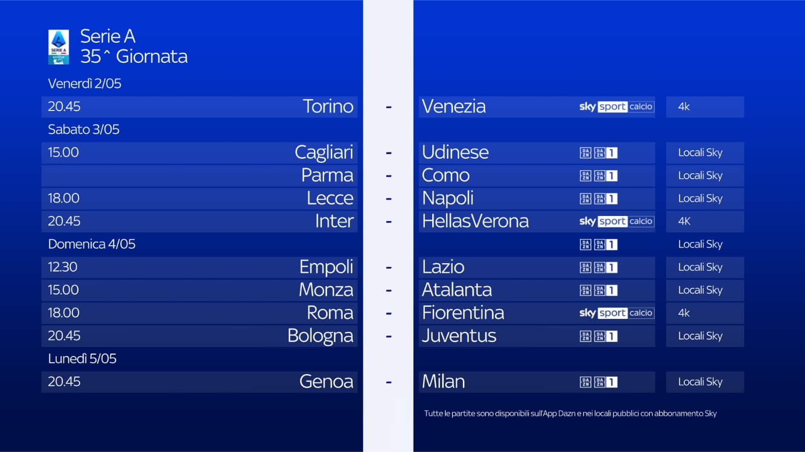 guida tvLa partita Monza-Atalanta della 35^ giornata di Serie A, si gioca domenica 4 maggio alle ore 15 e sarà in diretta sulla app di DAZN e sul canale DAZN, disponibile al canale 214 del telecomando Sky