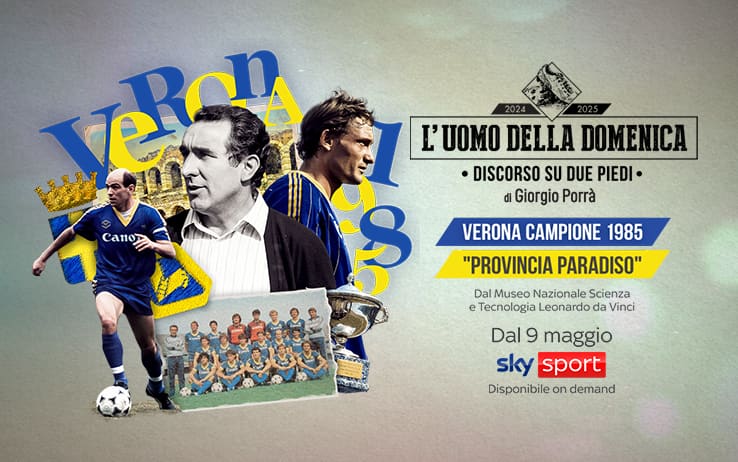 Una stagione irripetibile, un’impresa scolpita nella memoria collettiva del calcio italiano. È dedicata allo storico scudetto del Verona la nuova puntata de “L’Uomo della Domenica – Discorso su due piedi” (dal Museo Nazionale Scienza e Tecnologia Leonardo da Vinci di Milano) il format originale di Sky Sport firmato da Giorgio Porrà, che a quarant’anni da quella straordinaria cavalcata ci riporta nel cuore di una favola vera, figlia del genio di Osvaldo Bagnoli e della forza di un gruppo operaio, libero e visionario. Era il 1985 quando il Verona, squadra di una città non capoluogo di regione, riscrisse la geografia del potere calcistico italiano. Lo fece non grazie ai fuoriclasse, ma attraverso una lucida progettualità, un collettivo coeso e una filosofia semplice e geniale, capace di sovvertire ogni gerarchia. Un modello alternativo nell’epoca delle frontiere aperte, in cui spiccavano Maradona, Platini, Zico, Falcao, Socrates e Rumenigge.