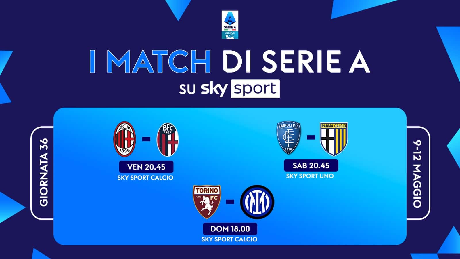 Il trentaseiesimo turno di Serie A si gioca da venerdì 9 a lunedì 12 maggio. Le 3 partite in diretta su Sky e in streaming su NOW saranno: Milan-Bologna, Empoli-Parma e Torino-Inter. La giornata di campionato si apre venerdì 9 maggio con Milan-Bologna, in diretta su Sky Sport Calcio, Sky Sport 4K, Sky Sport 251 e in streaming su NOW. Sono tre gli appuntamenti del sabato. Si inizia alle 15.00 con Como-Cagliari, si prosegue alle 18.00 con Lazio-Juventus mentre alle 20.45 è il momento di Empoli-Parma, in diretta su Sky Sport Calcio, Sky Sport UNO, Sky Sport 251 e in streaming su NOW. La domenica si apre alle 12.30 con Udinese-Monza e alle 15.00 è il momento di Verona-Lecce. Alle 18.00 Torino-Inter su Sky Sport Calcio, Sky Sport 4K, Sky Sport 251 e in streaming su NOW. La domenica si chiude alle 20.45 con Napoli-Genoa. Due gli appuntamenti del lunedì di campionato che chiudono il 36^ turno di campionato: alle 18.30 Venezia-Fiorentina e alle 20.45 Atalanta-Roma.