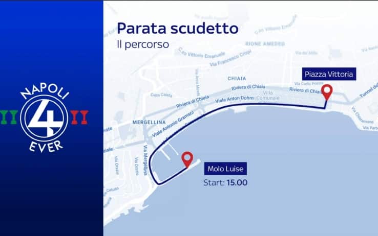 Questo il dettaglio della sfilata scudetto del Napoli campione d'Italia per la quarta volta. La squadra arriverà al Molo Luise a bordo di imbarcazioni per poi salire sui bus, che sfileranno sul lungomare a piazza Vittoria e ritorno. Un circuito di circa 3 km che si snoderà sotto la vigilanza di 1.000 uomini tra forze dell'ordine, vigili del fuoco, vigili urbani e polizia metropolitana affiancati da 1.300 steward e 400 unità della Protezione civile regionale. Saranno chiuse le stazioni delle linea 6 che insistono sull'area e la funicolare di Mergellina. Chiuse anche tutte le scuole della I Municipalità. Per consentire ai tifosi di assistere alla sfilata, verrà realizzato una sorta di 'contenitore' i cui accessi saranno posizionati alle due estremità della Villa comunale, al cui interno sarà consentito l'accesso a circa 150mila persone. L’intera area dell’evento sarà, inoltre, perimetrata e contingentata con accessi presidiati, e delimitata a nord da Via Giordano Bruno e Via Riviera di Chiaia, a ovest da Piazza Sannazzaro, a est da Piazza della Vittoria. All'interno saranno garantiti controlli ai varchi, misure di sicurezza, assistenza al pubblico e presidio sanitario. Ma per consentire anche ad altri di poter partecipare, pure se a distanza, saranno installati 4 maxi schermi in piazza Sannazaro, all'altezza di Villa Pignatelli, Largo Sermoneta e via Partenope per accogliere, complessivamente, altre 50mila persone. Il dispositivo di vigilanza sarà applicato anche sullo specchio d'acqua che porterà i giocatori al Molo Luise e sarà installato un sistema di barriere anti sfondamento sul lato della Villa comunale per interdire il lato mare.